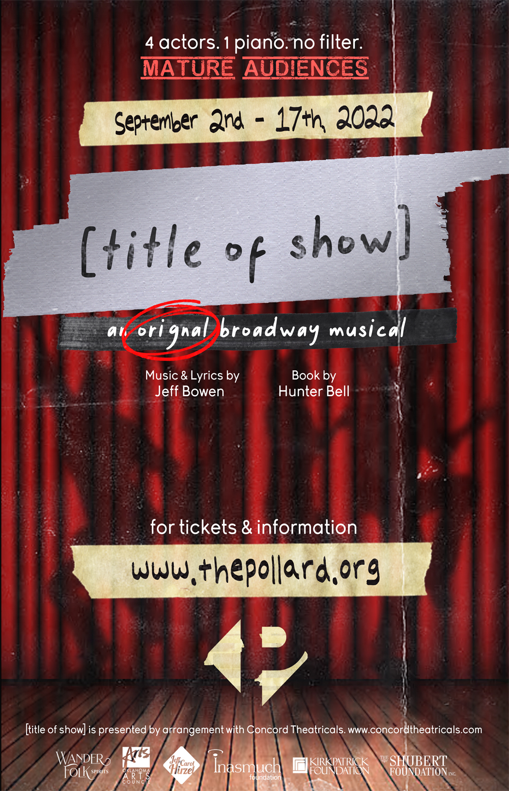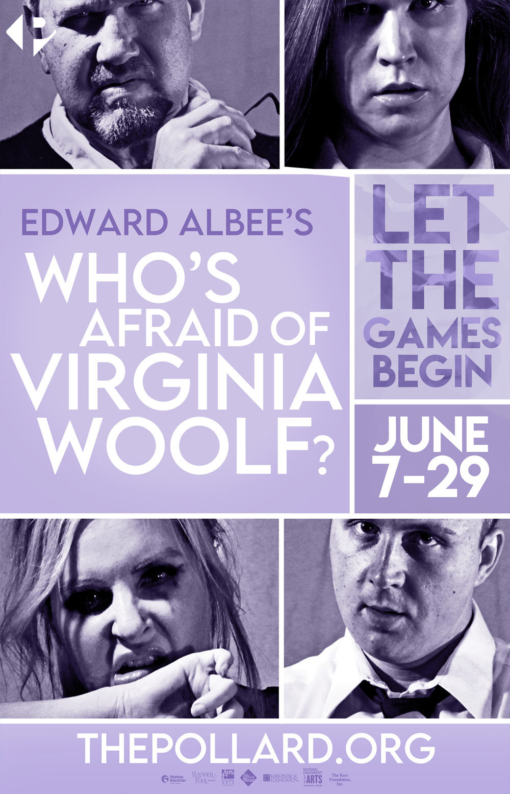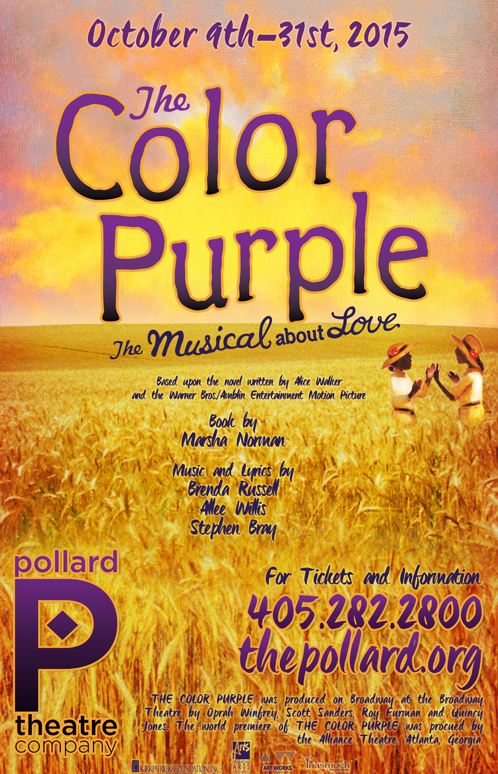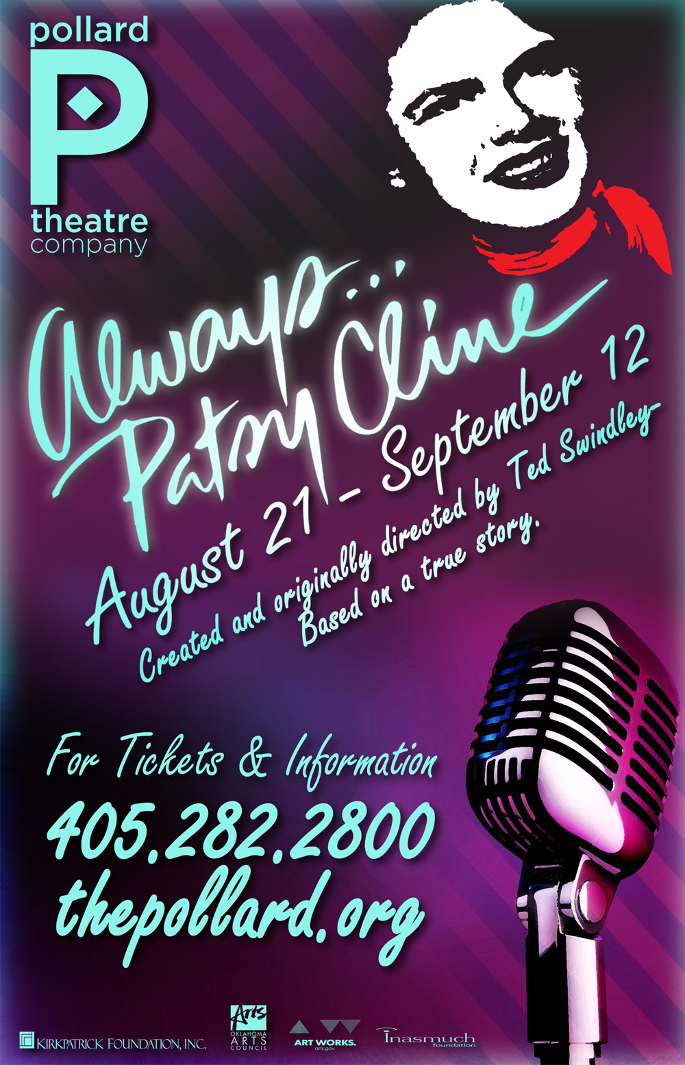 Pollard Theatre Company is a 501 (c)(3) nonprofit, whose mission is to produce professional theatre that engages and inspires Oklahoma’s audiences, and contributes to the quality of life and economy of our community and state. Additional assistance is provided by the Oklahoma Arts Council and the National Endowment for the Arts.